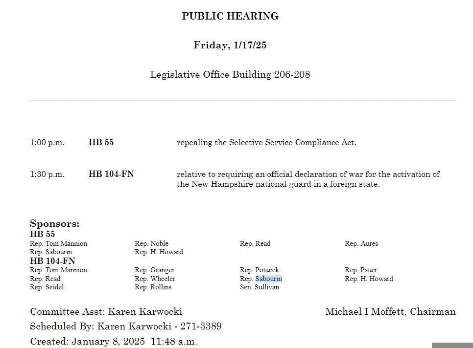 The heavy-hitting Defend the Guard is already scheduled for a hearing, Friday January 17 at 1:30pm at the Legislative Office Building in Concord NH, Room 206! Preceding that is my bill to prune out Selective Service Compliance Act from RSA at 1pm. If you can make it, please show up to testify!